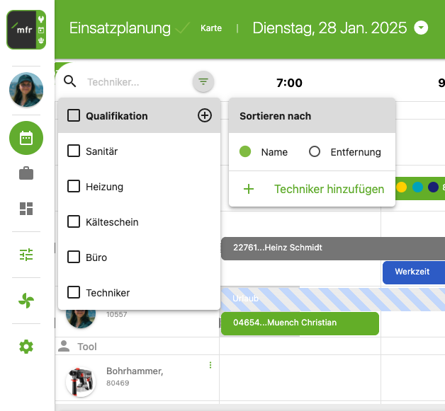 Solang die Nutzer in mfr angelegt sind können diese über das "+ Techniker hinzufügen" gesucht und der Einsatzplanung hinzugefügt werden.